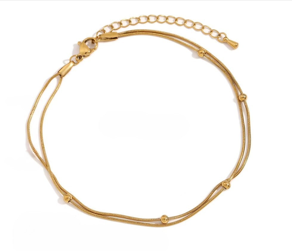 El Brazalete Mina es la combinación perfecta entre delicadeza y estilo moderno. Su diseño de doble cadena tipo serpiente, adornado con pequeñas esferas doradas, crea un efecto sofisticado y armonioso. Fabricado en acero inoxidable 316L y bañado en oro de 18K, es una pieza versátil que complementa cualquier look con un toque de lujo.